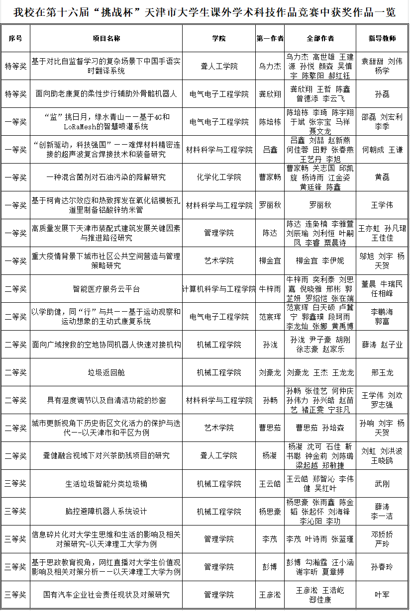 近日,由团市委、市委教育工委、市科技局、市教委、市科协、市社科院、市社科联、市学联联合举办的第十六届“挑战杯”天津市大学生课外学术科技作品竞赛最终成绩揭晓。我校共报送自然科学类学术论文、哲学社会科学类社会调查报告和学术论文、科技发明制作类31项作品参赛,其中11项作品入围市级终审决赛。经专家评审,最终共获得20项等级奖,其中特等奖2项,一等奖6项,二等奖7项,三等奖5项,同时我校荣获“市级优秀组织单位”荣誉称号。