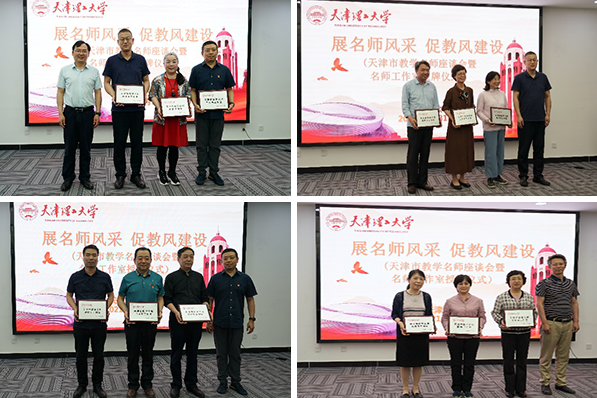 座谈会首先为我校12名在职的天津市教学名师举行了“天津市教学名师工作室”的授牌仪式,发挥教学名师的示范和引领作用,帮助青年教师不断提高课堂教学水平,通过“传帮带”,做到“以老带新,以优促新”,共同推进我校教风师风建设,切实提升教书育人水平、人才培养质量。