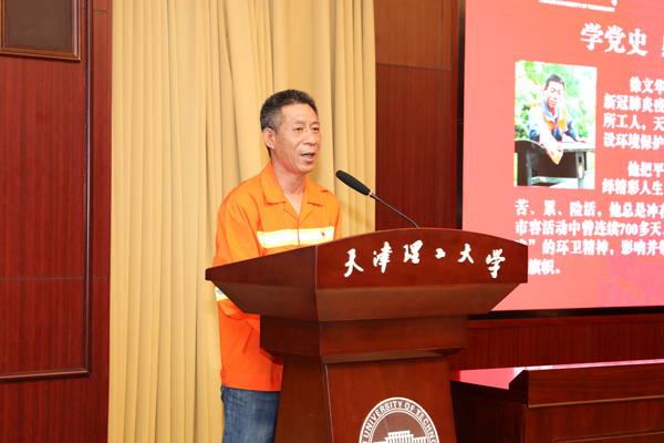 仪式结束后,劳动育人实践导师徐文华为师生作题为《学党史 感党恩 我与祖国共奋进》讲座。徐老师质朴生动地讲述自己的大学梦、事业梦和安居梦,分享32年如一日践行“宁愿一人脏,换来万家净”环卫精神的心路历程。最后,他寄语天理学子要永葆感恩心、责任心、进取心、敬畏心,把平凡的岗位作为实现人生价值的舞台,用诚实劳动演绎精彩人生。
