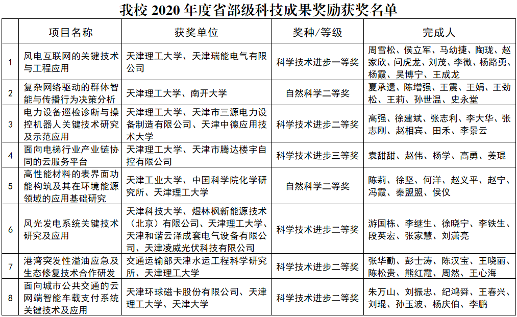 日前,天津市人民政府发布了《关于颁布2020年度天津市科学技术奖的决定》(津政发〔2021〕10号),我校8项科技成果获得天津市科学技术奖励。其中,天津市科技进步一等奖1项,天津市自然科学二等奖2项,天津市科技进步二等奖4项,天津市科技进步三等奖1项,获奖数量和等级居于市属高校前列。