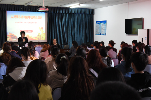 社会发展学院紧扣“学思践悟”深入开展党史学习教育宣讲活动,邀请全国教育系统先进工作者、天津市三八红旗手、“全国党建工作标杆院系”项目负责人、学校“老马”辅导员工作室负责人、党史学习教育校级宣讲团成员马红健老师到院宣讲。马红健老师以《从毛泽东诗词看中国革命历史—新民主主义革命时期的革命情怀》为题,给全院党员师生上了一堂生动党史学习教育课。马老师从毛泽东及其诗词、新民主主义革命的历史、从新民主主义革命看毛泽东诗词”三个方面,选取《西江月·井冈山》《七律·长征》《沁园春·雪》等诗词,带领师生从毛主席诗词创作背景、诗意赏析、斗争精神等方面欣赏毛主席诗词“湖海荡波澜,全无斧凿痕”之美,通过分析毛泽东诗词回望新民主主义革命史,帮助师生更好地理解中国共产党人的初心使命,引领师生做到学史明理、学史增信、学史崇德、学史力行。