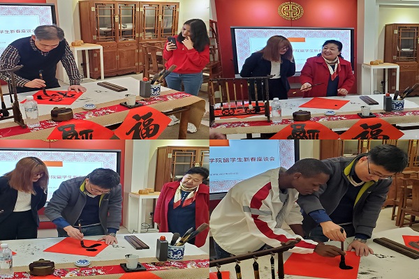 座谈会围绕“腊月二十九,贴春联”主题展开。中国文化展示室,各式书体的福字、对联、吊钱、中国结等精美装饰映入眼帘,使得留学生们不禁赞叹“真漂亮,‘年味’太浓了!”。学院老师分别从节日习俗和书法艺术的角度为留学生们详细介绍了对联、吊钱、福字等春节传统文化元素内涵,并指导他们拿起毛笔纷纷写下了“福”、“我爱天理”等字,寄托新年的美好愿望。