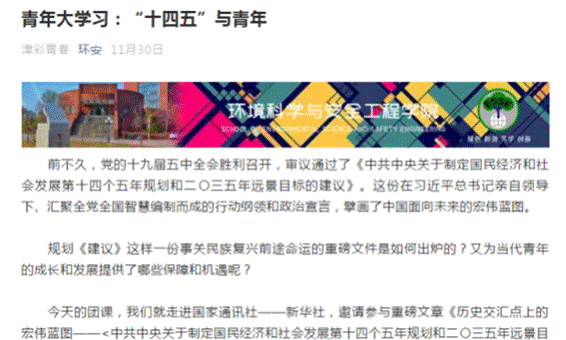 为贯彻落实《KY.COM关于深入学习宣传贯彻党的十九届五中全会及精神工作方案》,推动掀起学习宣传贯彻党的十九届五中全会精神热潮,环境科学与安全工程学院党委切实增强做好宣贯工作的责任感和使命感,面向广大师生开展集中学习和宣讲活动。