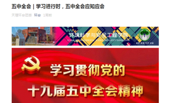学院党委充分利用学院官方微信平台和学院一楼大厅电子显示屏进行十九届五中全会应知应会、开展情况的宣传。自学院党委启动十九届五中全会学习宣传计划以来,学院官方微信共计推出相关推文7篇,全面宣传全会相关知识点和各师生党团支部学习宣贯情况,学院一楼大厅定期滚动播出十九届五中全会精神关键词,营造良好的学习宣传氛围。
