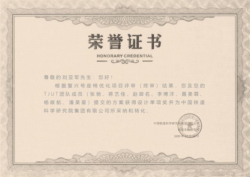 据了解,自2019年10月起,中国铁道科学研究院集团有限公司作为征集人面向全社会公开征集复兴号动车组一、二等座椅和商务客室优化提升方案。社会各界反响热烈,踊跃应征,截至2020年1月2日投稿结束,累计收到应征方案百余份。我校师生设计方案获得了甲方中铁集团高度评价和认可,在第一轮全国海选中入围前三十,在第二轮终评中获得单项成果奖,展现了我校实践教学所取得的显著成果。