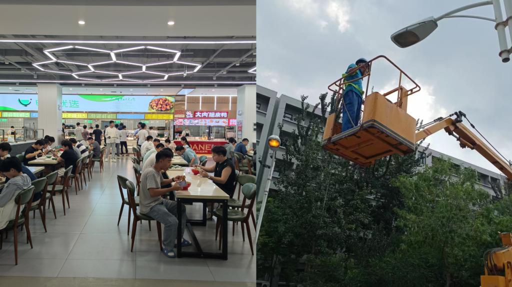 能维中心积极推进电力增容改造工作项目,改进增强部分教学楼、行政楼原有供电设备,从而满足公共教室、学院实验室用电需求。在暑假汛期,服务保障人员对校内防汛隐患点、防汛物资、排水设施、抽水泵、室外变电设备、防雷装置进行排查梳理巡检测试、及时整改,充分应对可能出现暴雨、汛情等突发情况。同时对全校特种设备、设施进行巡检,及时排除故障,消除安全隐患。维修人员随时在岗,保障校园内的维修及能源供应。他们用自己的专业知识和实际行动,为留校师生和迎新开学季的正常校园秩序保驾护航。
