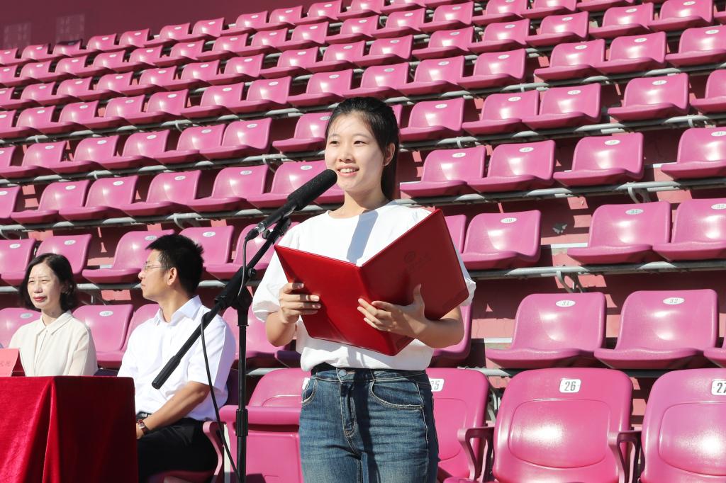 在校生代表、2021级机械工程学院本科生齐美成表示,在天理,大家拥有广阔而精彩的成长舞台,可以勇敢做不被定义的自己,奋斗才是青春的底色。她鼓励新生们要以实际行动,争做德能兼备的新时代天理人。