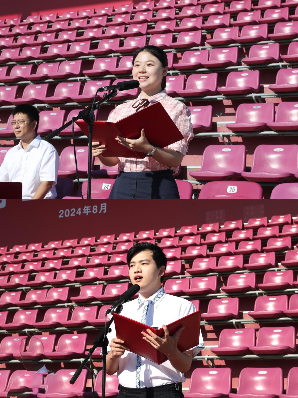 新生代表、2024级电气工程与自动化学院本科生朱芬慧和2024级马克思主义学院研究生王九龙,共同表达了对天理校园的认同感和归属感,对于学校新发展、新面貌感到骄傲与自豪,表示将牢记“重德重能 求实求新”校训,坚定理想信念、胸怀报国之志、潜心学术科研,奋力书写为中国式现代化挺膺担当的青春篇章。