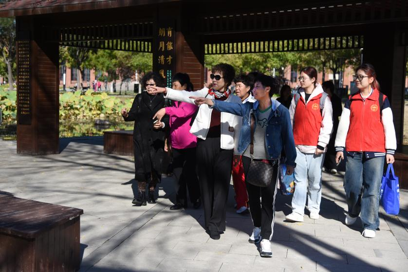 志愿者们引领盛阳园老年居民漫步明理湖畔,穿梭于体育馆、图书馆之间,在钟楼前驻足,静静品味校园风光。面对天理的秀美风光,现场老人们不禁回忆起自己的青春岁月,沉浸在对往昔时光的怀念之中,流露出对重返校园、重归“青春”的激动与喜悦之情。