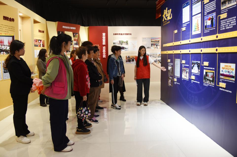 志愿者们带领老年居民步入校史展,详细了解学校的发展历史以及毕业生的杰出成就。恰逢建校四十五周年之际,老年居民们纷纷送上对学校的诚挚祝福。老年居民对学校的历史有了更为深入的认知,老人们声情并茂地讲述着年轻时的点点滴滴,现场欢声笑语,气氛热烈。