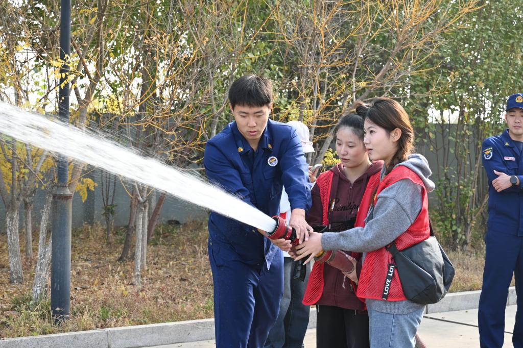 在防患未“燃”讲堂,同学们认真聆听了关于火灾危险性、预防措施和紧急应对策略等内容,并了解了消防装备的重要性和使用方法。在消防内务探秘环节,同学们参观消防站的消防员宿舍、休息室、器材库等功能区,深入了解消防员们整齐划一的内务管理和日常运作。随后,同学们近距离观察并体验灭火器、消防水枪、云梯消防车等消防器材,并在消防员的指导下学习如何正确使用这些器材。