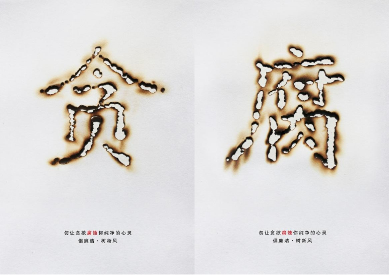 学院学生陈家柳创作了作品《腐蚀》,通过在纸上运用烫烧的手法,烧出“贪”和“腐”两个字,来警示贪念和腐败行为会腐蚀人们的心灵。