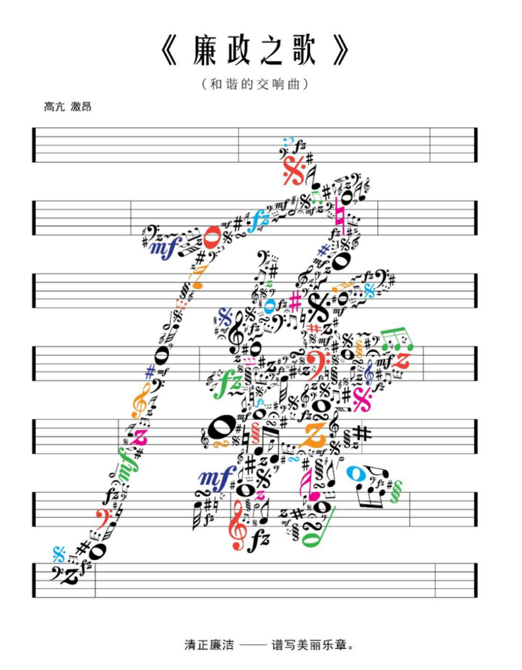 学院学生王欢创作的作品《清正廉洁—谱写美丽乐章》由五颜六色的音符组成“廉”字,希望大家能够意识到清正廉洁的重要性,建立良好的社会秩序。