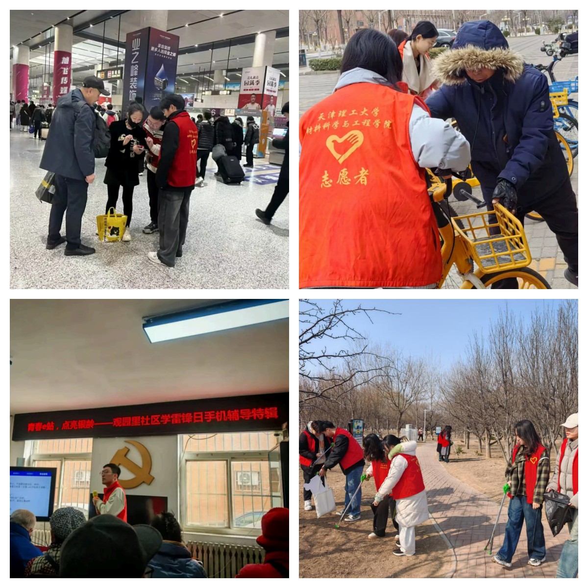 材料科学与工程学院青年志愿者分别前往天津西站地铁站、观园公寓、水上公园以及校园活动区进行志愿服务活动。在天津西站地铁站,志愿者们贴心地为有需要的乘客进行路线指引,同时维护地铁站正常秩序。在观园公寓,志愿者们开展手机课堂服务,为老年人们讲述如何正确安全地使用AI软件。在水上公园,志愿者们认真地维护游园秩序、爱园护绿、垃圾分类、擦拭座椅,让雷锋精神在笃行中传承榜样力量。在校园活动区,志愿者身披小马甲,手持垃圾袋维护校园整洁、打扫校园卫生,将违停的共享单车回归原位,为维护校园整洁贡献力量。