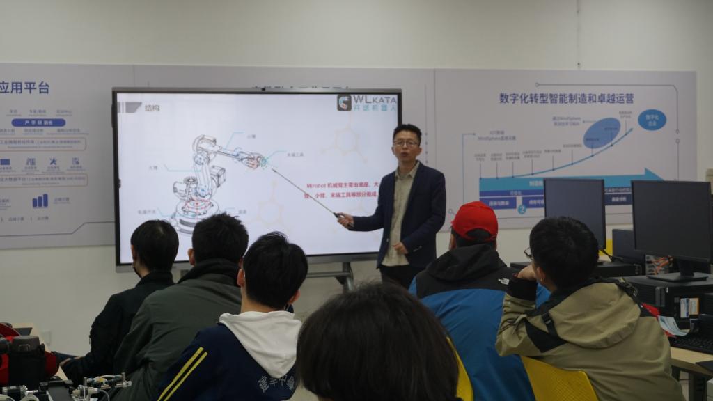 在“智造新视界”主题展厅,工程训练中心的导师团队带领学生们开启了一场特殊“旅程”。学生们直观见证物联网技术如何串联起产品设计、生产、物流全链条——智能机器人精准抓取物料,AGV小车穿梭运输,云端数据实时跳动。