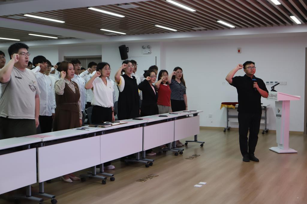 学院党委相关负责同志宣读了新发展学生党员名单,并勉励新党员们要发扬党的优良传统,严于律己,创先争优,为奋力谱写中国式现代化天津篇章贡献力量。党支部书记代表为新党员代表佩戴党员徽章。