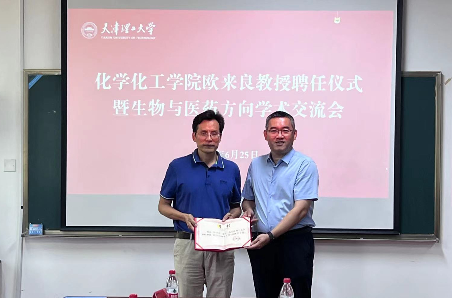 学院主要负责人对南开大学欧来良教授的到来表示热烈欢迎,并为其颁发聘书。他指出,伴随着欧来良教授的加入,将会推动学院生物与医药方向的师资队伍和科研团队建设,提高科研创新能力,促进人才培养质量,有效提高学院的社会服务能力。