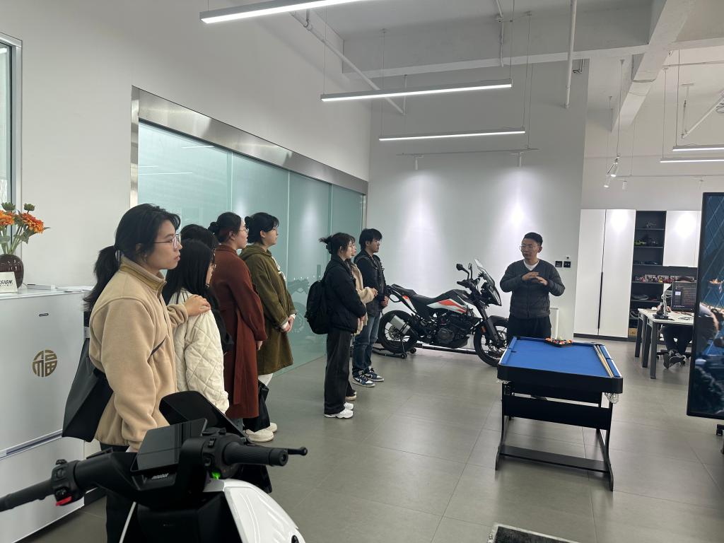 天津爱客设计有限公司主要进行二轮交通工具的外观设计研发。在校友带领下,师生参观了企业设计研发的多款摩托车、电瓶车,并深入了解了油泥模型制作。随后,校友就产品设计的专业特点、国内市场布局、设计分支与同学们展开讨论,为同学们展示企业设计的产品视觉效果图和渲染视频呈现,希望同学们戒骄戒躁,保持对专业学习的严谨、专注和耐心。
