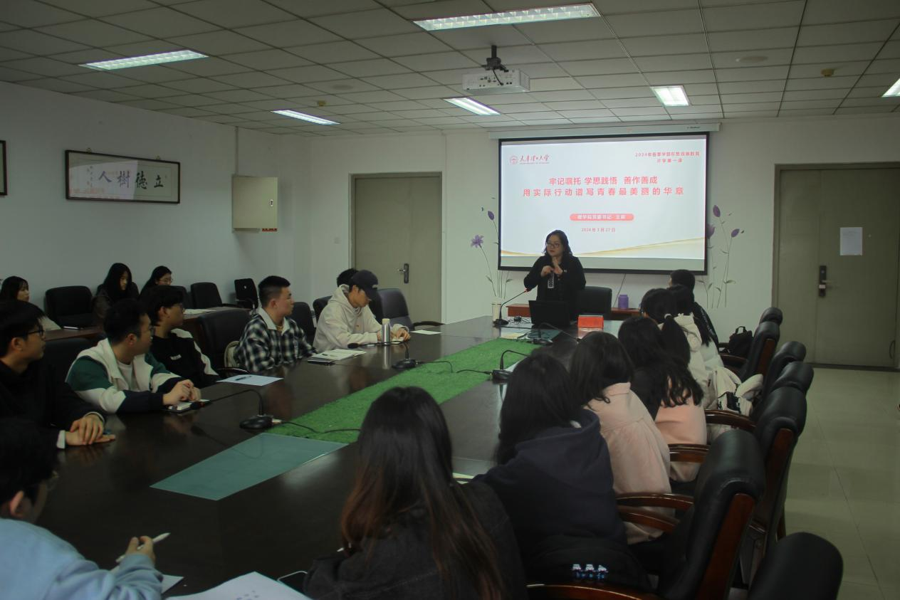 学院党委主要负责同志讲授题为“牢记嘱托 学思践悟 善作善成 用实际行动谱写青春最美丽的华章”的主题党课,带领学生党员和入党积极分子共同学习领会习近平总书记视察天津重要讲话精神,学习贯彻习近平文化思想,勉励学生们要牢记嘱托,自觉践行“四个善作善成”的重要要求,传承“重德重能、求实求新”校训精神,做挺膺担当的新时代天理人,为推动强国建设、民族复兴伟业贡献青春力量。