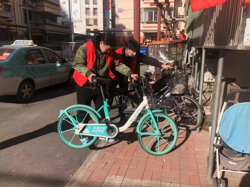 3月1日,学院青年志愿者来到佳安里社区,帮助摆放共享单车。在社区便民义诊服务点位,志愿者们辅助专业医生为社区居民进行医疗诊断。