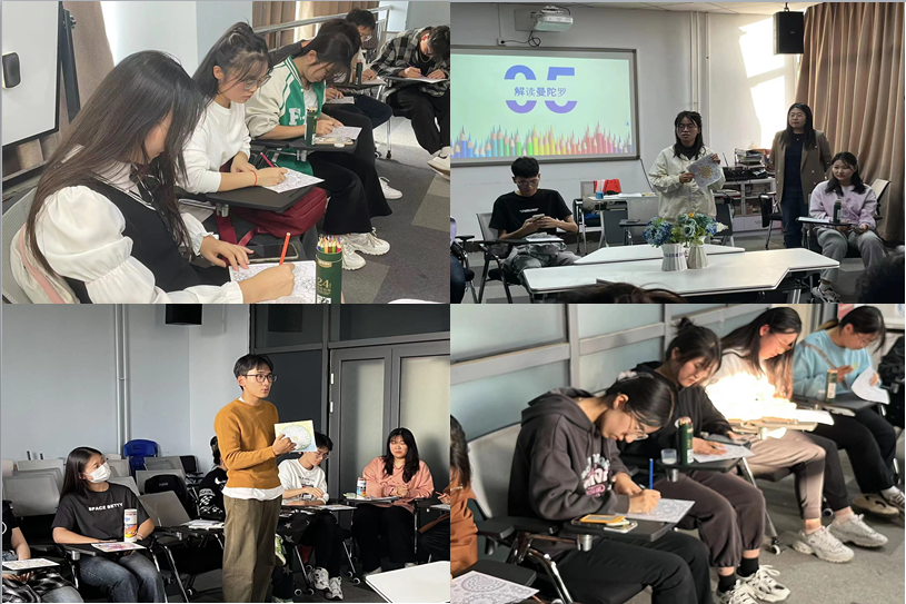 指导教师介绍了曼陀罗心理疗法的起源、绘画方式及主要作用等。随后,同学们随机抽取一张曼陀罗绘卡,选择自己喜欢的彩铅,用想象去涂色描绘,把心中的情绪、故事用色彩表达出来。一幅图画,一个故事,一段心灵的成长,简单的曼陀罗彩绘,是表达自我、释放情绪的“专属领地”。随后,同学们积极踊跃地分享自己的绘画感受。