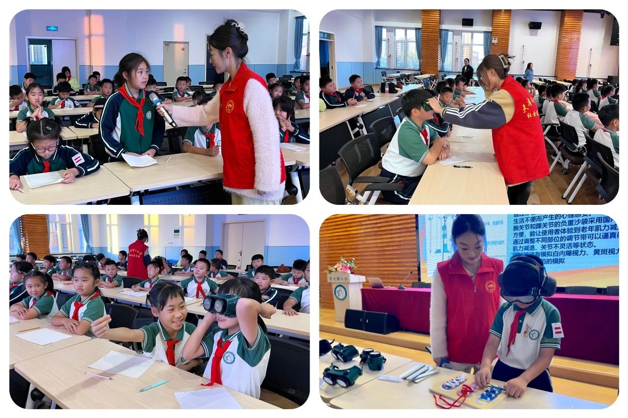 10月20日,社会发展学院组织老年学专业青年志愿者到西青区中北星光路小学开展尊老敬老模拟体验活动。