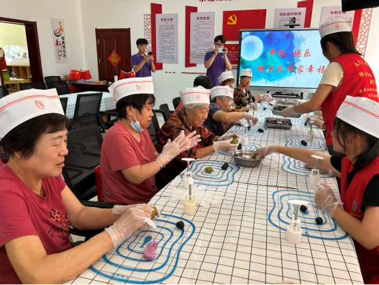 志愿者同社区居民共同制作出一个个寓意团圆和美满的月饼,在动手实践中体验中华传统文化的魅力,营造浓浓的节日氛围。