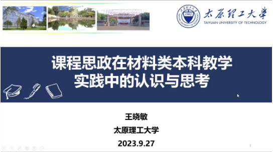 王晓敏以《课程思政在材料类本科教学实践中的认识与思考》为题开展专题讲座,他从课程思政建设开展的重要性和必要性出发,明确课程思政实施在育人工作中的重要意义,分析课程思政和思政课程间的紧密联系和各自特点。随后,她就太原理工大学材料学院在课程思政中的具体实践进行梳理和总结,介绍了思政元素与专业课程融合方式、评价体系和考察方式、教风学风建设相结合等方面的一些具体做法,同时凝练出了在实施工作中的六条主线。