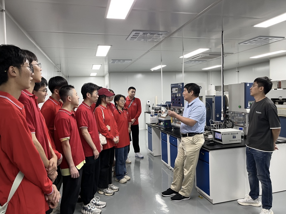 在天开西青园,师生一行来到袁志好教授团队的电池实验工厂,了解水系锌碘电池的前世今生。袁志好教授团队在国际上最早瞄准水系锌碘电池这一全新技术启动研发,经过十多年的攻关,终于在2021年第一届全国博士后创新创业大赛上获得金奖。为了让成果尽快应用,袁志好教授团队一边继续研究,一边考察选址,最终在天开西青园找到了适合成果转化的电池实验厂房。作为第一批入驻天开西青园的实验团队,厂房的实验环境和加工条件都为研究成果的产业化提供了极大的助力。