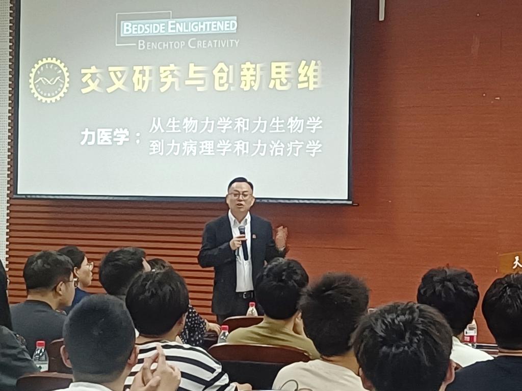 日前,应天津市先进机电系统设计与智能控制重点实验室邀请,西安交通大学生命学院院长徐峰教授来校进行学术交流访问,并作题为《交叉研究与创新思维——力医学:从生物力学和力生物学到力病理学和力治疗学》的学术报告。机械工程学院、生命健康智能检测研究院、天津大学力学系、武警特色医学中心等单位100余名师生参加了本次学术交流。