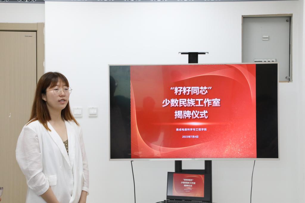 集成电路科学与工程学院相关负责人介绍了芯火润智工作坊和“籽籽同芯”少数民族工作室建立的初衷和创建背景,并表示,学院高度重视学生的思想政治教育工作,两个工作室成立后,将常态化开展各种育人活动、帮扶行动,进一步促进各民族学生交往交流交融。