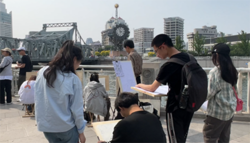 “艺绘津门”活动带领学生走出校门,在旧址前触摸津门红色历史,在海河畔从历史走入现实,在文物古迹中探索民俗渊源,实地实景开展课程思政教育,切实拉近学生与天津第二故乡的距离,感悟城市深厚文化内涵和巨大发展潜力,以画作涵养天津情怀,进而激励学生服务天津发展,扎根津沽大地努力奋斗!