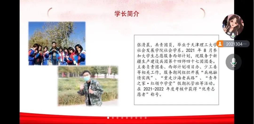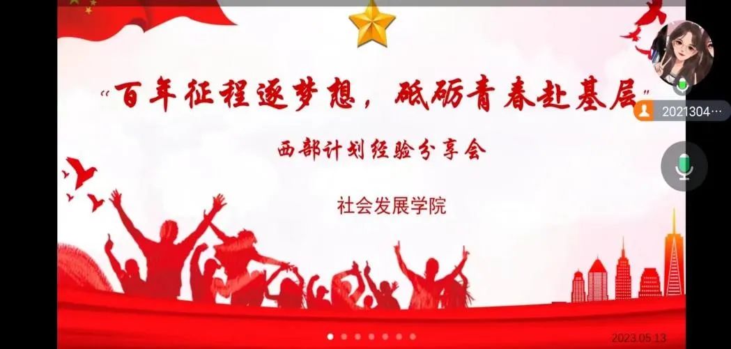 为促使社会发展学院学子全面了解西部计划,进一步激励广大青年积极投身于西部计划服务之中,5月13日下午,社会发展学院在线上举办了“百年征程逐梦想,砥砺青春赴基层”西部计划经验分享会,特邀请到现服务于新疆建设生产兵团第十四师四十七团团委的优秀毕业学子张清晨向大家分享相关经验,各年级同学积极参与。