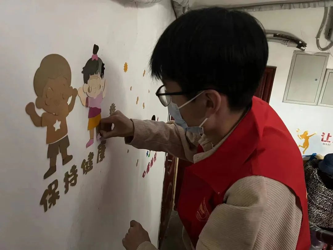 在李七庄街道集贤里社区楼门文化改造活动中,社会发展学院志愿者们和社区居民一起装饰小区楼道,根据墙面的大小、空白范围等现实情况,合理划分装饰区域,确定装饰画的张贴布局。改造后的楼道变得更加整洁美观,居民在上下楼时有了更加愉悦的审美体验,生活的幸福感和满意度得到了大幅提升。