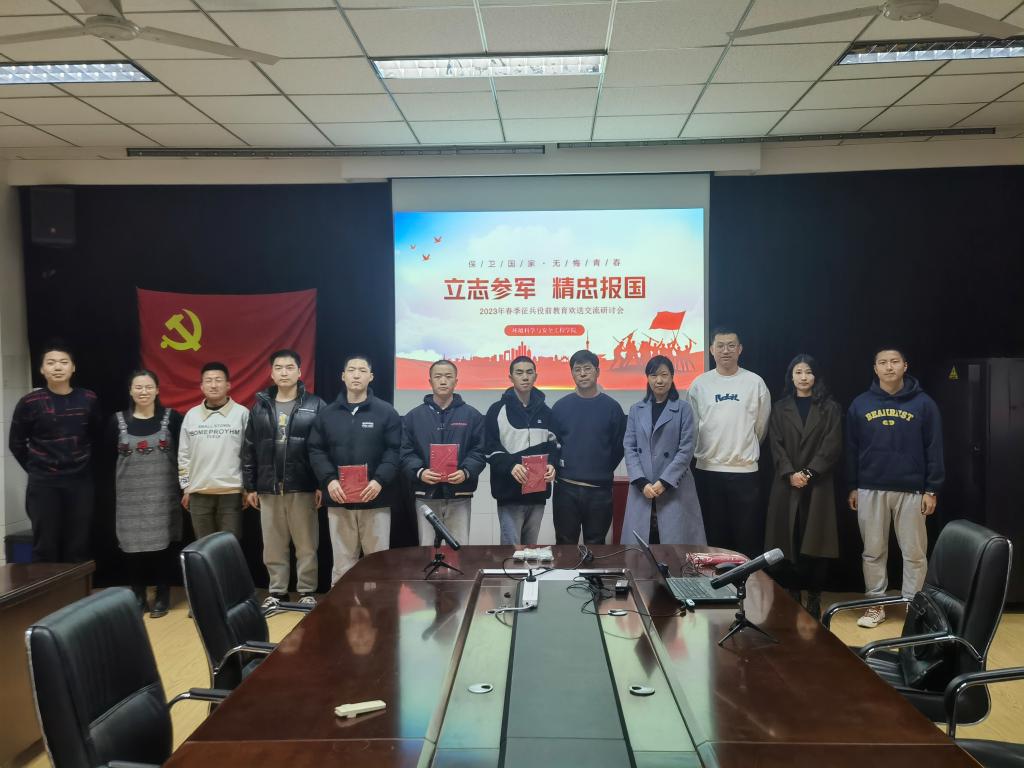 为深入学习贯彻党的二十大精神,弘扬热血青年追逐青春梦想、投身强军兴军的家国情怀,2月27日,环境科学与安全工程学院召开了春季征兵役前教育欢送交流研讨会,学院党委副书记于洁、全体辅导员参加,并邀请退伍学生潘昱、范双杰、雷万鹏作役前训练经验分享。