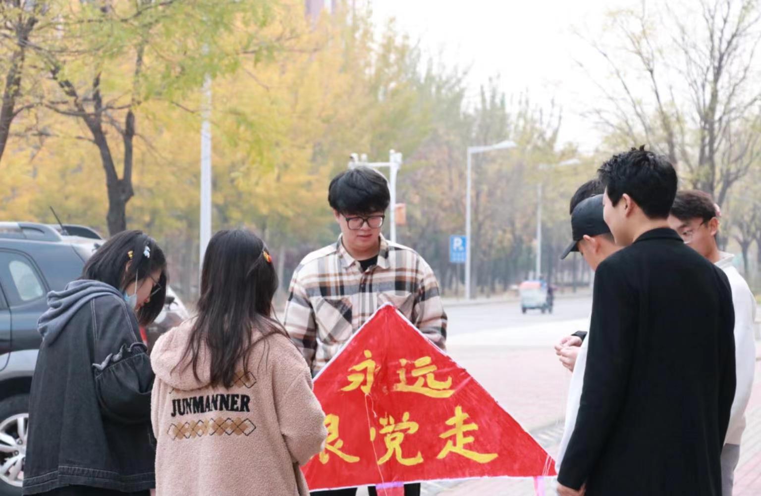 同学们以拳拳爱国之心,共同在以红色为底色的风筝上执笔描绘“永远跟党走”五个字,在这个过程中,同学们一笔一画,细致入微,以实际行动表明永远跟党走的信心与决心。之后,大家轮流放飞风筝,书写着“永远跟党走”五个大字的风筝翱翔于天际之中。
