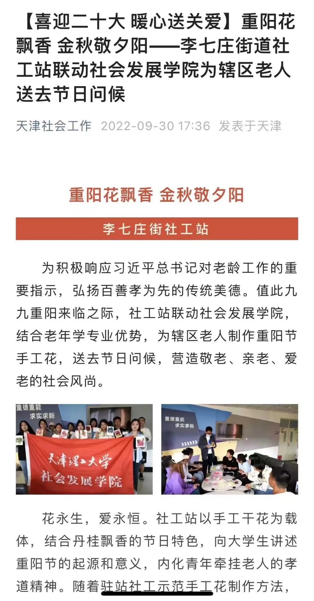 为弘扬百善孝为先的传统美德。九九重阳来临之际,社工站联动社会发展学院,结合老年学专业优势,为辖区老人制作重阳节手工花,送去节日问候,营造敬老、亲老、爱老的社会风尚。