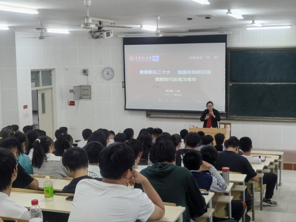 为深入学习贯彻习近平新时代中国特色社会主义思想,进一步加强新生入学教育,做好学生思想引领工作,9月29日,理学院开展2022级新生形势政策教育开学第一课,学院党委书记王茹作题为《青春献礼二十大 强国有我新征程 做新时代的有为青年》的专题报告。