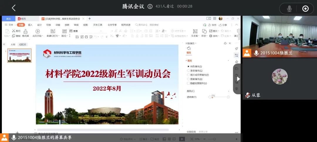 为确保2022级本科生军训活动顺利进行,做好学生的军训生活指导工作和安全教育工作,让同学们尽快适应新环境。近日,材料科学与工程学院召开军训动员大会,学院党委负责同志、带训教官、学院全体带队教师出席本次大会,2022级400余名新生线上参加动员会。