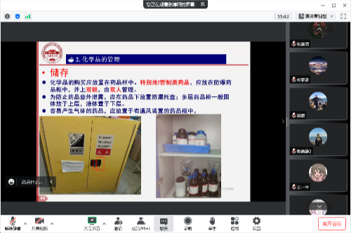 随后,学院科研秘书刘珊、化工系专业教师张博阳分别从“研究生培养方案、学籍学位管理、实验室安全”等方面进行详细讲解。张老师结合近几年高校实验室发生的安全事例,梳理实验室常见安全隐患,分析安全事故易发诱因、预防措施,讲述危险化学品的安全管理与个人防护,以及安全注意事项,强调全体学生要增强自身安全意识、安全知识水平,遵守各项安全规定,切实维护好实验室的安全运行。