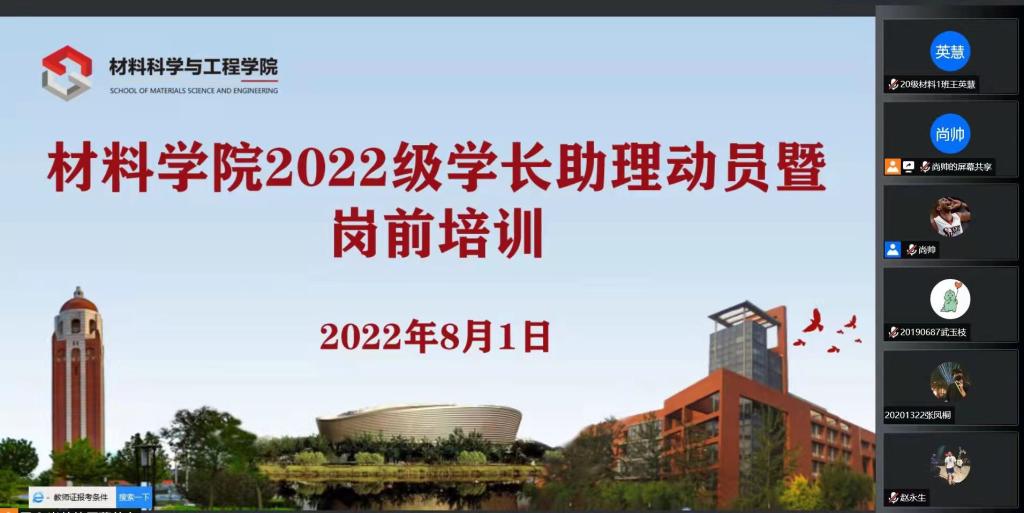 为进一步推进学院朋辈辅导工作落实落地,培养一支政治素质过硬、学习成绩优异、工作能力较强的学长助理队伍,充分发挥优秀学长的传帮带作用,2022年8月1日,材料科学与工程学院通过线上方式举办2022级学长助理工作动员暨岗前培训会。