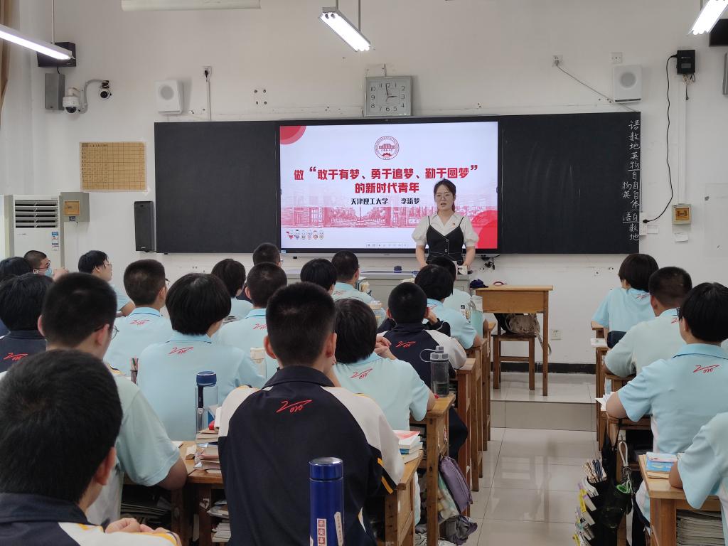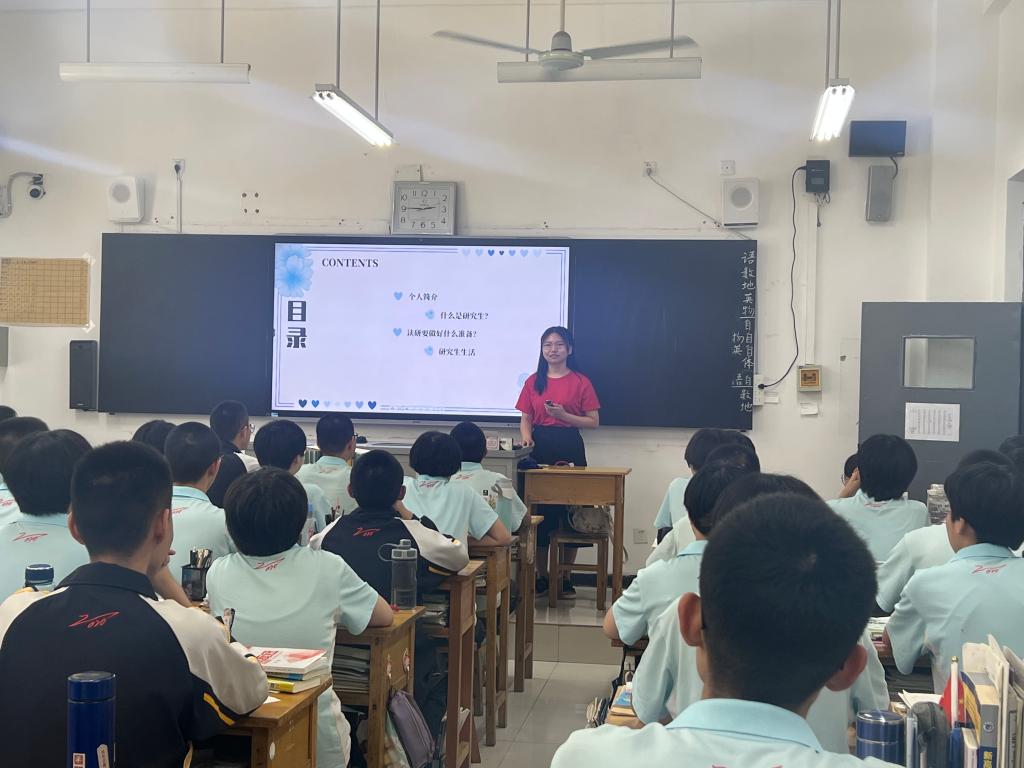 实践团来到河北正定中学2020级高三20班,为高三学子开展3堂思政课。学院2021级本科生蒲世丹分享自己高中到大学的转变,从学习方式、科技竞赛、评奖评优、校园文化、志愿活动等方面对比高中与大学不同,激励中同学们努力学习奋战高考。