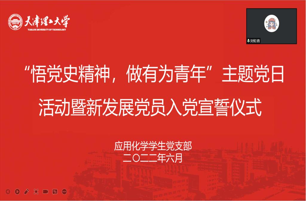 为迎接党的二十大胜利召开,激发学生党员爱国情怀,保持党员队伍生机活力,化学化工学院应用化学学生党支部于6月23日在19号楼511室以线上线下相结合的方式开展“悟党史精神 做有为青年”主题党日活动,并为6月新发展的预备党员举行入党宣誓仪式,支部全体党员参加此次活动。