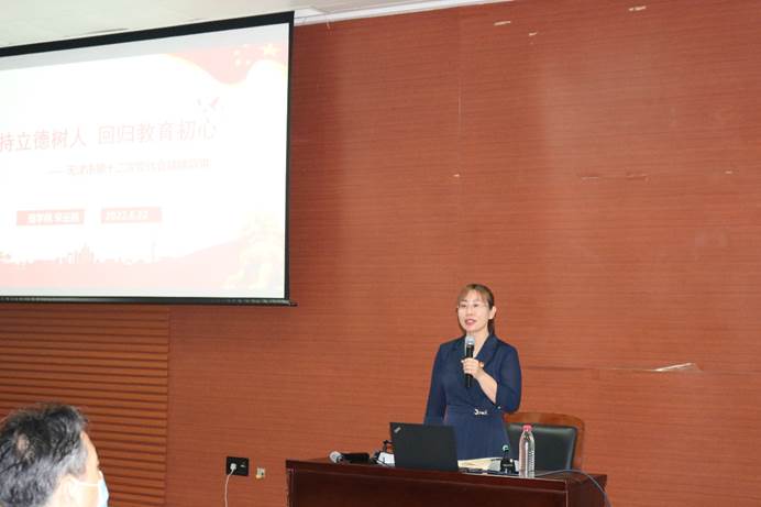 会上,宋云燕同志向全院教师传达中国共产党天津市第十二次代表大会精神,表示天津市第十二次党代会是在天津奋力开启全面建设社会主义现代化大都市新征程的关键时期,召开的一次具有重大意义的会议。李鸿忠书记做的题为《坚定捍卫“两个确立” 坚决做到“两个维护” 坚定不移沿着习近平总书记指引的方向阔步前进 奋力开创全面建设社会主义现代化大都市新局面》的报告主题鲜明,立意深远,高举旗帜,政治站位极高,通篇贯彻习近平新时代中国特色社会主义思想,深入贯彻习近平总书记对天津工作“三个着力”重要要求和一系列重要指示批示精神,全面总结了过去五年天津各项事业取得的历史性成就,谋划了天津未来五年的奋进蓝图,是一个解放思想,实事求是,求真务实,谋划未来的好报告,是一个诠释忠诚,维护核心,拥戴领袖的好报告。