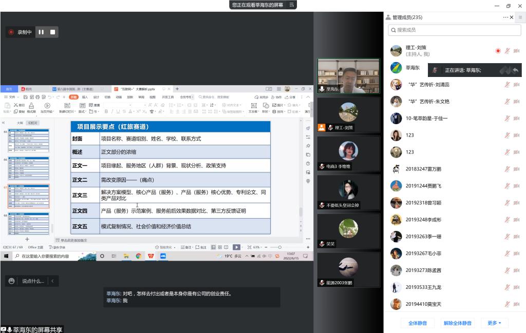 莘海东老师从第八届“互联网+”大赛主赛道与青年红色筑梦之旅赛道评审规则入手,结合五个维度分析了国赛评审要点,指出了比赛的基本要求。对于校赛答辩的项目展示要点中不同赛道如何结合封面、行业背景、服务现状、产品、解决方案、目标客户、团队成员、财务、宣传、愿景等方面进行PPT设计进行了逐页分析,并结合具体案例讲解了如何根据评审要点开展项目的打磨精进。创客们就项目支撑论文专利、成长组公司法人、路演答辩人员配置等方面与莘老师进行了互动交流,线上培训气氛活跃,创客们表示收益良多。