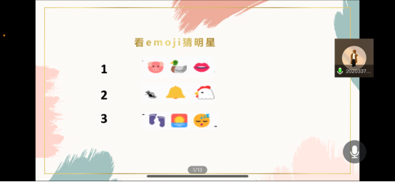 参会同学通过“表情猜词”游戏迅速活跃气氛,同学们争先打开麦克风或通过聊天界面抢答,氛围欢乐融洽;参会同学纷纷表达了希望疫情尽快结束,回归校园生活的期待。