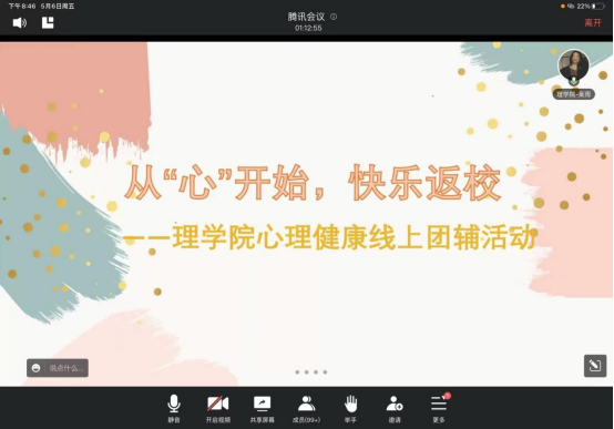 5月6日晚,理学院通过线上形式开展了心理健康团辅活动,各年级心理委员、宿舍长等100余位同学参与了本次活动。