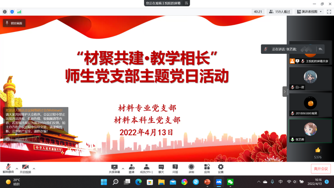 为进一步巩固拓展党史学习教育成果,充分发挥党建引领作用,充分发挥师生党员在教风学风建设方面的先锋模范作用,材料专业党支部与材料本科生党支部于近日利用线上会议联合开展“材聚共建·教学相长”主题党日活动,材料专业全体师生党员以及20级本科生共计120余人参加此次活动。