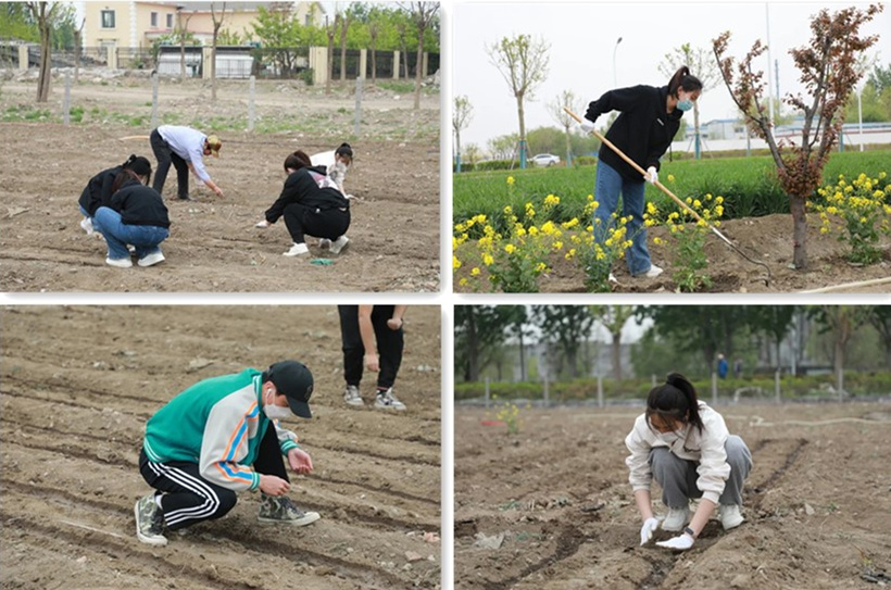 在老师的指导和带领下,同学们分工有序、齐心协力。虽动作生疏,但依旧不辞辛苦,拿起铁耙,一起翻土、除草。在农耕老师的指导下,大家还进行了育苗活动,先挖垄浇水,再种黄瓜、点豆角,最后覆土。大家分工合作,做得有板有眼,每一名同学都积极主动地参与劳动。虽然汗水湿透衣服,但集体劳动使人快乐!