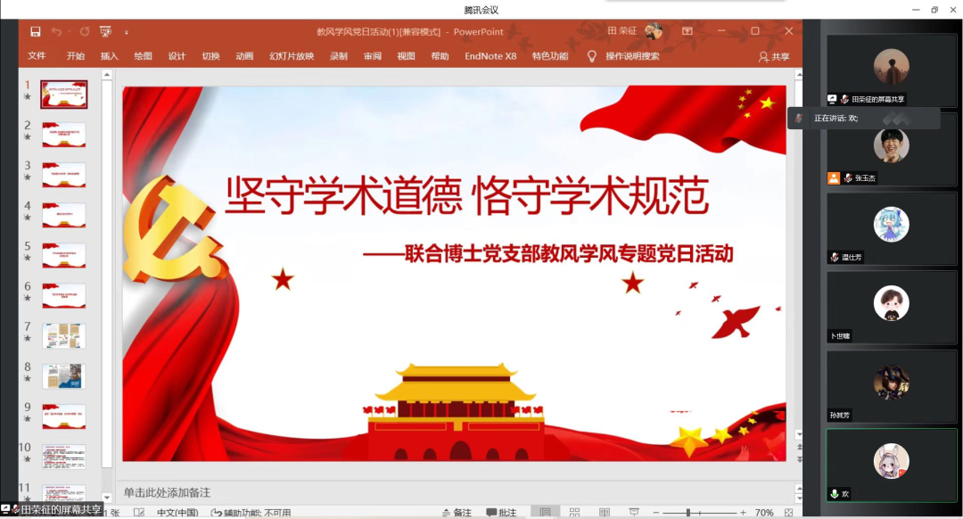 为进一步加强研究生教风学风建设,按照学院“教风学风建设再讨论、再部署”工作实施方案的要求,近日,联合博士党支部通过腾讯会议线上开展“坚守学术道德,恪守学术规范”教风学风专题党日活动。